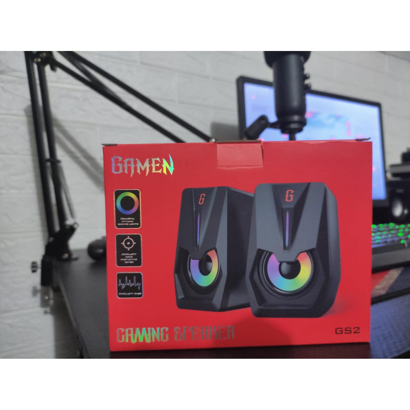 Speaker gaming dari brand GAMEN dengan efek lampu RGB yang keren. Memberikan kualitas suara stereo yang jernih untuk pengalaman bermain game dan menonton film yang lebih imersif.